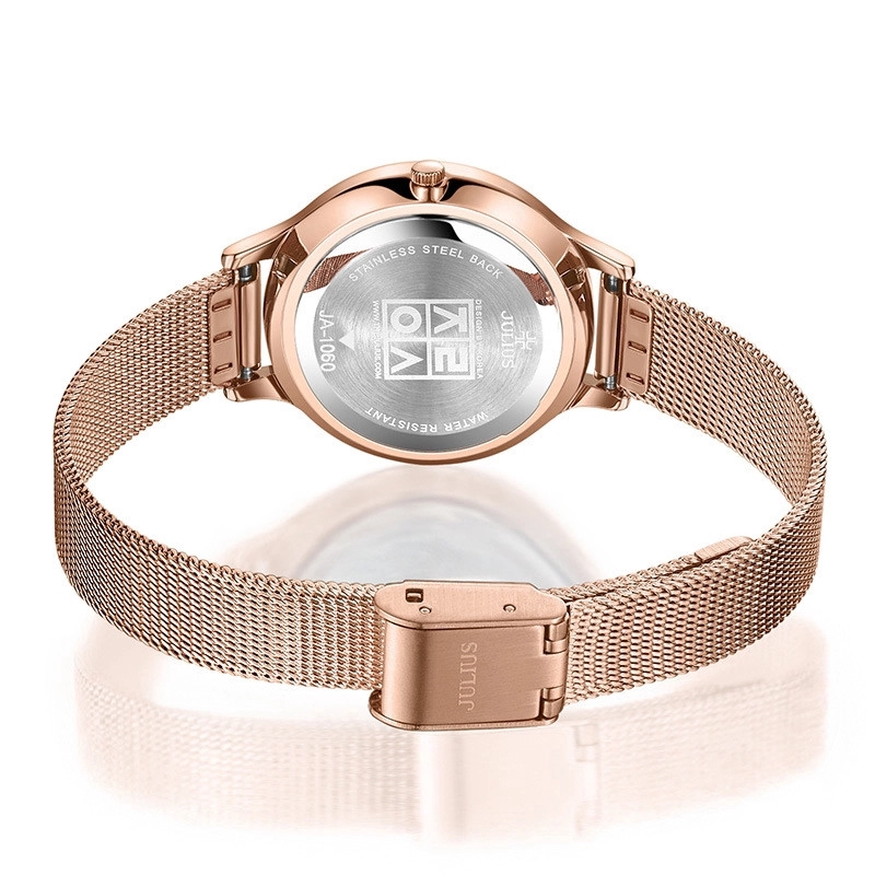 کلمه JULIUS از حروفی تشکیل شده که هریک مخفف کلمات لذت، خاص، عشق، ایدهآل، غیرعادی و درخشان هستند. استانداردهای کیفی مانند ماشین آلات ژاپنی، ضد آب، مدرنترین فناوری آبکاری، نوار فولادی ضد زنگ، شیشههای معدنی سکوریت شده و مقاومت در برابر ضربه همگی در انواع ساعت جولیوس جمع آوری شدهاند. بنابراین با انتخاب و خرید ساعت جولیوس همزمان از طراحی مدرن و منحصر به فرد در کنار کیفیت عالی آن لذت خواهید برد. این ساعتها دقیقا ویژگیهای پنهان در نام جولیوس را به همراه دارند و همیشه درخشان باقی میمانند.